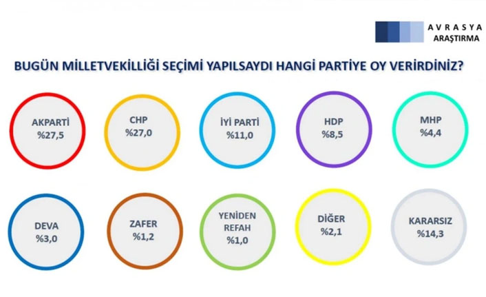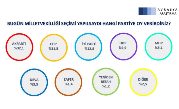 Avrasya Araştırma, 28 Ocak 2 Şubat tarihleri arasında; 26 ilde 2 bin 460 kişiyle yaptığı anketin sonuçları açıklandı. Buna göre AKP ve CHP arasındaki fark yüzde 0.6.