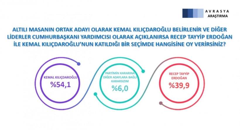 Katılımcılara, "Altılı masanın ortak adayı Kemal Kılıçdaroğlu belirlenir ve diğer liderler cumhurbaşkanı yardımcısı olarak açıklanırsa Recep Tayyip Erdoğan ile Kemal Kılıçdaroğlu'nun katıldığı bir seçimde hangisine oy verirsiniz?" sorusu da yöneltildi.