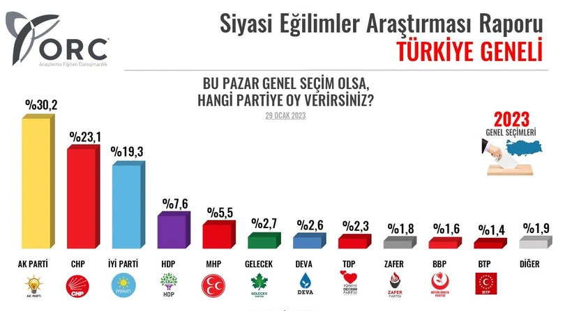 ORC Araştırma, 23 26 Ocak tarihleri arasında 45 ilde gerçekleştirilen araştırmada 4 bin 580 kişi ile Yüz Yüze anket yöntemiyle görüşmeler yapıldı. "Bu pazar genel seçim olsa, hangi partiye oy verirsiniz?" sorusunun yöneltildiği araştırmada Cumhur İttifakı ile Millet İttifakı arasındaki fark 13 puan oldu.