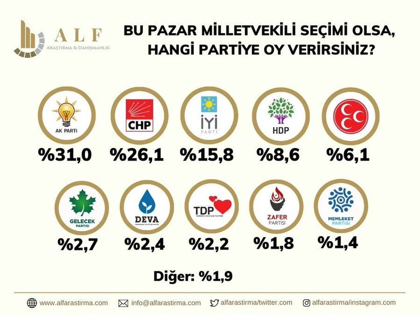 ALF Araştırma, Ocak 2023 Siyasi Eğilim Araştırması'nın sonuçlarını paylaştı. 18 24 Ocak tarihleri arasında 26 ilde gerçekleştirilen araştırmada 2000 kişi ile Yüz Yüze anket yöntemiyle görüşmeler yapıldı.