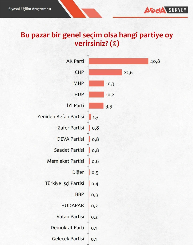 Diğer anketlerle tutarsızlığı dikkat çeken Areda Survey'in araştırmasında katılımcıların yüzde 40,8'i bu pazar genel seçim olsa AKP'ye oy vereceğini söyledi. CHP yüzde 22,6 ile ikinci sırada, MHP 10,3 ile üçüncü sırada, HDP ise 10,2 ile üçüncü sırada yer aldı.