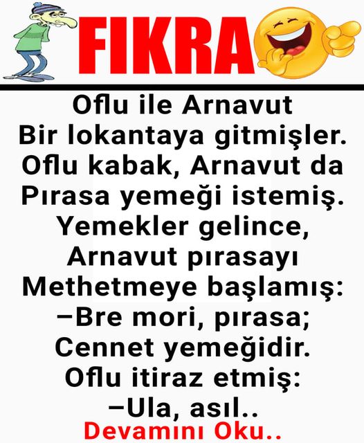 Gülmek güzeldir..Oflu ile Arnavut bir lokantaya gitmişler. Oflu kabak, Arnavut da pırasa yemeği istemiş. Yemekler gelince, Arnavut pırasayı methetmeye başlamış: – Bre mori, pırasa cennet yemeğidir. Oflu itiraz etmiş: – Ula, asıl…