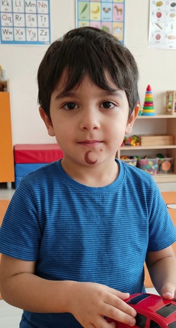 çenesinde hemen altında küçük, hilal şeklinde bir doğum lekesi.