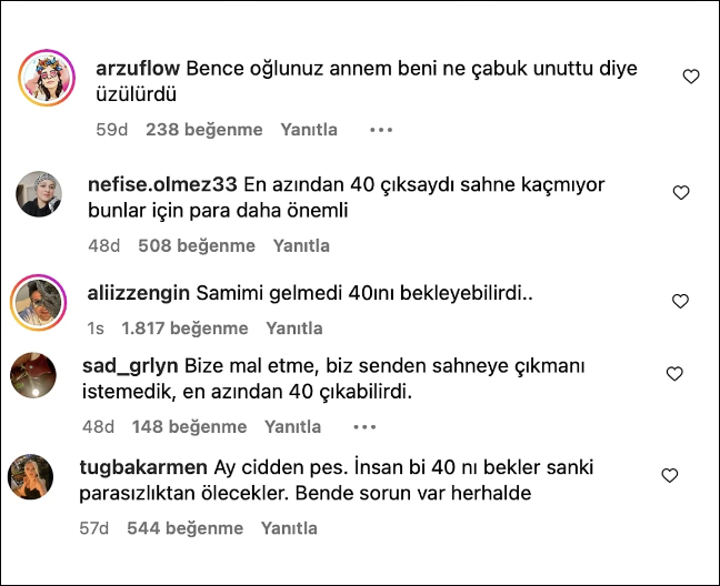 Soyman'ın bu kararı sosyal medyada kullanıcılarının bazılarından eleştiri almasına sebep oldu. Ünlü isme: 'Bence oğlunuz, 'Annem beni çabuk unuttu' diye üzülürdü.', 'En azından 40'ı çıksaydı', 'Sahne kaçmıyor, yazık', 'Canım sahneye çıkmak istedi dese daha samimi olurdu' gibi eleştiriler geldi.
