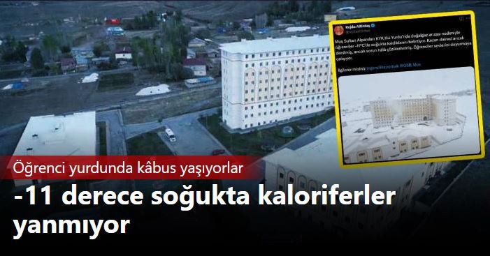 Gazeteci Rojda Altıntaş sosyal medya hesabından yaptığı paylaşımda doğalgaz arızası nedeniyle Muş Sultan Alparslan KYK Kız Yurdu’nda kalan öğrencilerin -11°C’de soğukta kaldıklarını belirtti.