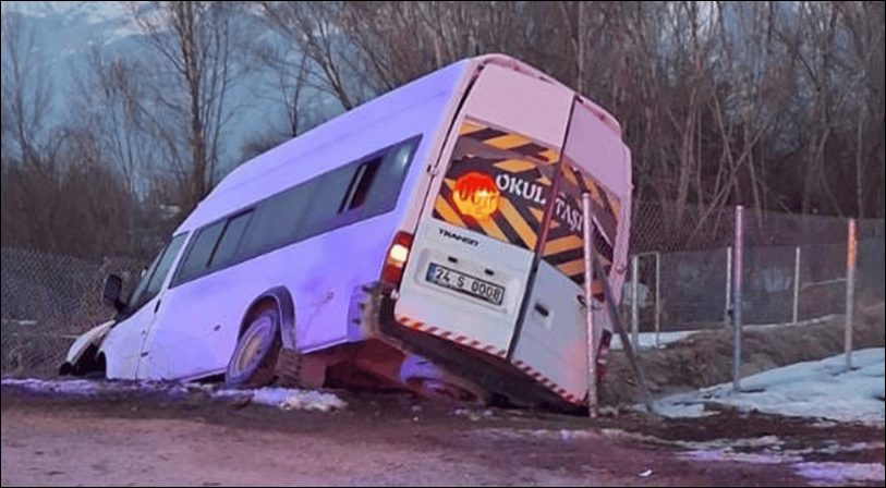 Erzincan'da öğrenci servisinin sulama kanalına düşmesi sonucu 10’u öğrenci 11 kişi yaralandı. Ç.D’nin kullandığı 24 S 008 plakalı öğrenci servisi minibüsü, Erzincan-Çağlayan kara yolunda seyir halindeyken virajı alamayarak sulama kanalına düştü. Kazayı gören vatandaşlar, 112 Acil Çağrı Merkezi'ni arayarak jandarma ve sağlık ekiplerinden yardım istedi.