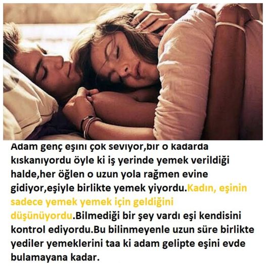 Adam genç eşini çok seviyor,bir o kadarda kıskanıyordu öyle ki iş yerinde yemek verildiği halde,her öğlen o uzun yola rağmen evine gidiyor,eşiyle birlikte yemek yiyordu.Kadın, eşinin sadece yemek yemek için geldiğini düşünüyordu.Bilmediği bir şey vardı eşi kendisini kontrol ediyordu.Bu bilinmeyenle uzun süre birlikte yediler yemeklerini taa ki adam gelipte eşini evde bulamayana kadar.