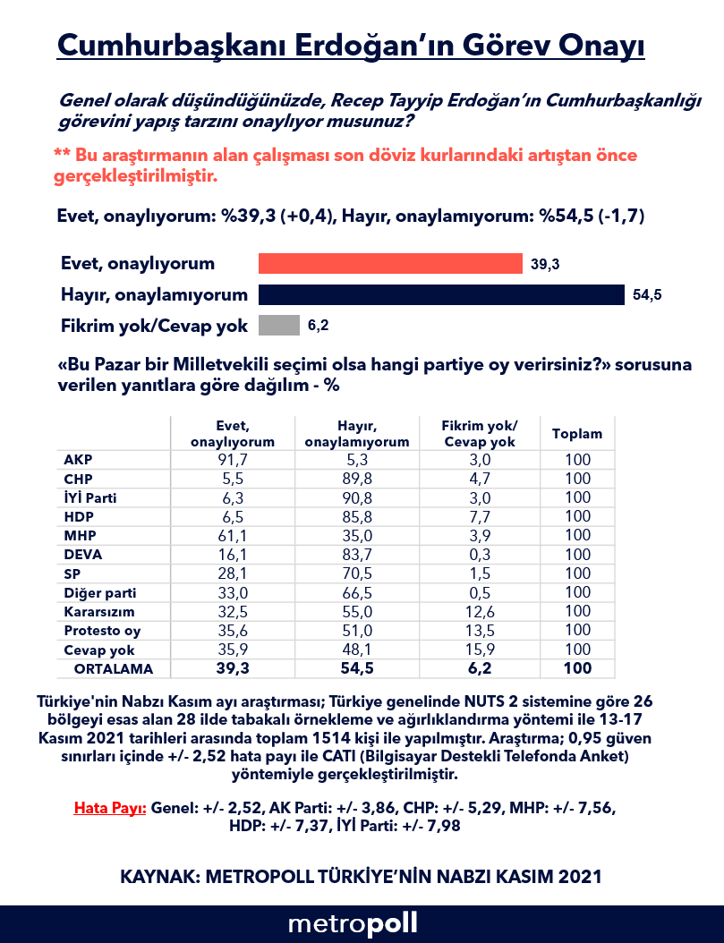 Ankete göre; Erdoğan'ı onaylayanların oranı yüzde 39,3'te kaldı. Erdoğan'ı onaylamayanlar ise yüzde %54,5 oldu.