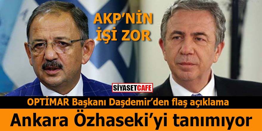Optimar Araştırma Şirketi’nin Yönetim Kurulu Başkanı Hilmi Daşdemir, AK Parti’nin Ankara adayı Mehmet Özhaseki’nin, Mansur Yavaş’ın en az 10 puan gerisinde olduğunu ifade etti. Daşdemir araştırma verilerini paylaştığı açıklamada, İstanbul’da Binali Yıldırım’ın önde olduğunu söyledi ve “Ankara için ise AKP aleyhine bir durum söz konusu. AKP, parti anlamında önde. İsim bazında ise Mansur Yavaş, Özhaseki’den 10 puan öne çıkıyor. Ankara AKP için oldukça riskli noktalardan birisi” diye konuştu.