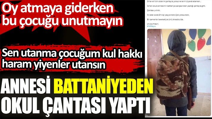 Türkiye’de enflasyon ve hayat pahalılığının geldiği noktayı gösteren bir fotoğraf sosyal medyada gündem oldu. Fotoğrafta bir çocuğun annesinin battaniyeden yırttığı parçayla yaptığı çantayla okula gittiği görülüyor.