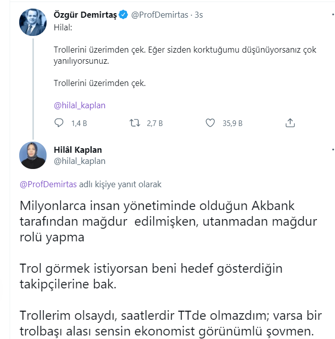 Hilal Kaplan Özgür Demirtaş’ın "Trollerini üzerimden çek" paylaşımına Kaplan, “Milyonlarca insan yönetiminde olduğun Akbank tarafından mağdur edilmişken mağdur rolü yapma trol görmek istiyorsan beni hedef gösterdiğin takipçilerine bak Trollerim olsaydı saatlerdir TT'de olmazdım; varsa bir trolbaşı sensin ekonomist görünümlü şovmen” şeklinde karşılık verdi.
