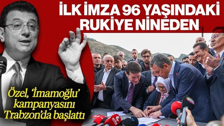 Trabzon’dan büyük bir kampanya başlatacaklarını duyuran Özgür Özel, ilk imzayı 96 yaşındaki Rukiye Köroğlu'nun atacağını belirterek, şunları söyledi: "Caminin dışına çıktığımda Rukiye Teyzem geldi, 96 yaşında. Rukiye Köroğlu. Dün akşam hiç uyumadım, sabahı bekledim. Seni görmeye, Ekrem oğlum için ilk imzayı ben vermeye geldim dedi. Bu anlamlı, bu önemli imzayı buradan ilk kez Rukiye anneden alacağız."
