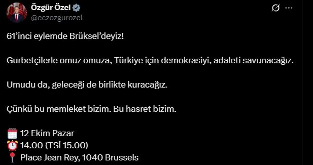 CHP Genel Başkanı Özel, "61’inci eylemde Brüksel’deyiz! Gurbetçilerle omuz omuza, Türkiye için demokrasiyi, adaleti savunacağız. Umudu da, geleceği de birlikte kuracağız. Çünkü bu memleket bizim. Bu hasret bizim" ifadelerini kullandı.