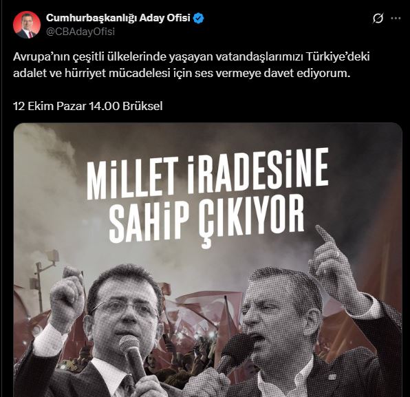 İmamoğlu ise, "Avrupa’nın çeşitli ülkelerinde yaşayan vatandaşlarımızı Türkiye’deki adalet ve hürriyet mücadelesi için ses vermeye davet ediyorum" dedi.
