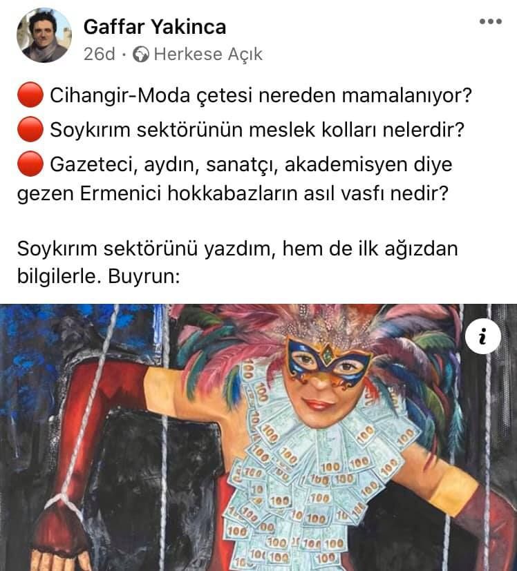 “Son yıllarda Ermeni Soykırımı’nın “ekmeğini yiyen” akademisyen/yazar/STKcı/gazeteci/yayıncı/fotoğrafçı/şarkıcı vs “sevgi kelebeklerinden” 1 aydır ses yok. TC’dekilere tek sözüm yok ama TC dışındakilerin bu ölü taklidi kabul edilemez. Ekmek kapısı değil Ermenilerin geçmişi.