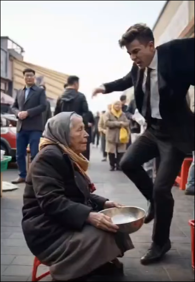 Olanları gören yerel bir adam yanlarına geldi. Takım elbiseli adamı büyükanneyi itmekten sertçe uzaklaştırdı.