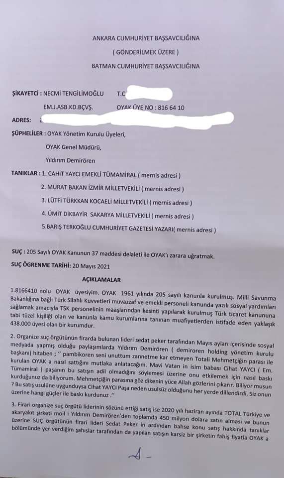 Emekli Astsubay Necmi Tengilimoğlu, OYAK'ın zarara uğratıldığı iddiasıyla Batman Cumhuriyet Başsavcılığına suç duyurusunda bulundu.
