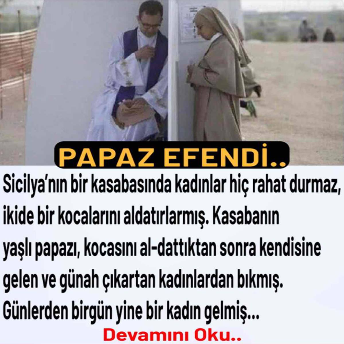 Sicilya’nın bir kasabasında kadınlar hiç rahat durmaz, ikide bir kocalarını a.ldatırlarmış. Kasabanın yaşlı papazı, kocasını aldattıktan sonra kendisine gelen ve günah çıkartan kadınlardan bıkmış. Günlerden bir gün, yine bir kadın gelmiş, “Papaz efendi! Şeytana uyup yine kocamı aldattım” demiş.
