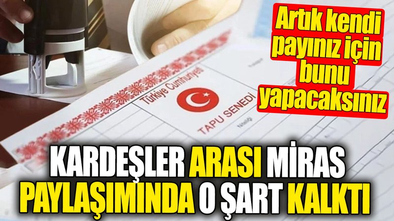 Kardeşler arası miras paylaşımında o koşul kaldırıldı! Kendi payınız amacıyla bundan sonra bunu yapacaksınız.Artık kardeşler arasında miras paylaşımı yazılı olarak yapabilir ve karşılıklı olarak imzalandığında geçerli olacak. Bu yeni düzenlemeyle birlikte, KENDİ PAYINIZ İÇİN BUNU YAPACAKSINIZ Hisseli tapu sahipleri, tapu satışı amacıyla çözüm yolları arayışında. Hisseli tapularda, tapunun devri amacıyla hisse sahiplerinin ortak karar alması gerekiyor.