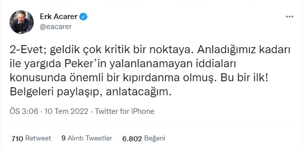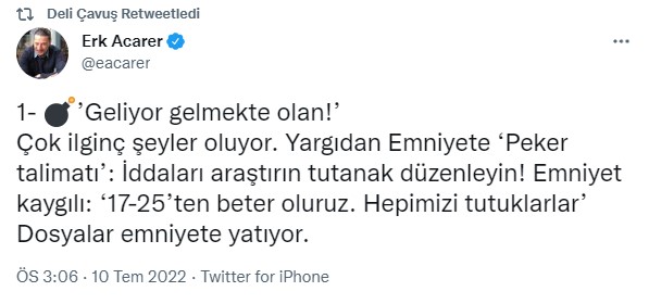 2-Evet; geldik çok kritik bir noktaya. Anladığımız kadarı ile yargıda Peker’in yalanlanamayan iddiaları konusunda önemli bir kıpırdanma olmuş. Bu bir ilk! Belgeleri paylaşıp, anlatacağım.