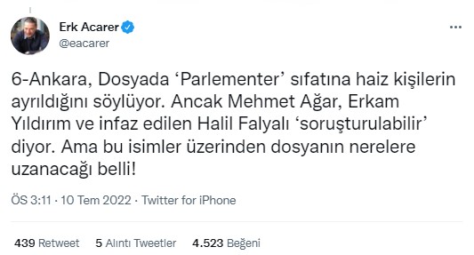 6-Ankara, Dosyada ‘Parlementer’ sıfatına haiz kişilerin ayrıldığını söylüyor. Ancak Mehmet Ağar, Erkam Yıldırım ve infaz edilen Halil Falyalı ‘soruşturulabilir’ diyor. Ama bu isimler üzerinden dosyanın nerelere uzanacağı belli!