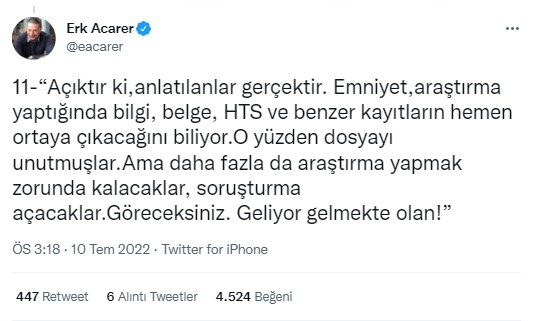 11-“Açıktır ki,anlatılanlar gerçektir. Emniyet,araştırma yaptığında bilgi, belge, HTS ve benzer kayıtların hemen ortaya çıkacağını biliyor.O yüzden dosyayı unutmuşlar.Ama daha fazla da araştırma yapmak zorunda kalacaklar, soruşturma açacaklar.Göreceksiniz. Geliyor gelmekte olan!”