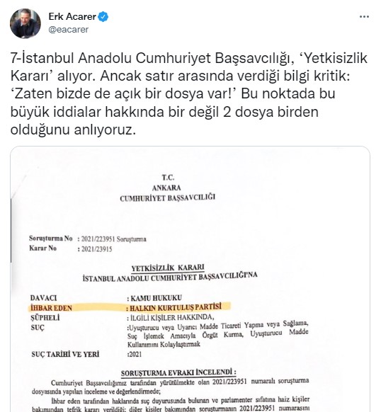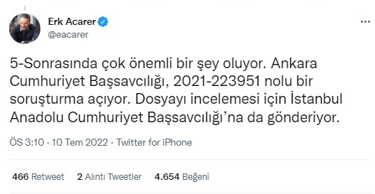 5-Sonrasında çok önemli bir şey oluyor. Ankara Cumhuriyet Başsavcılığı, 2021-223951 nolu bir soruşturma açıyor. Dosyayı incelemesi için İstanbul Anadolu Cumhuriyet Başsavcılığı’na da gönderiyor.
