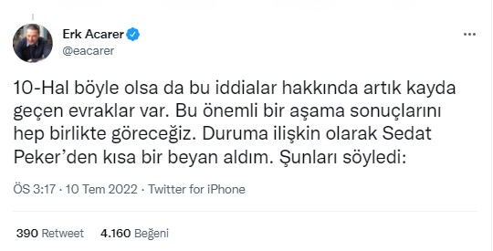 10-Hal böyle olsa da bu iddialar hakkında artık kayda geçen evraklar var. Bu önemli bir aşama sonuçlarını hep birlikte göreceğiz. Duruma ilişkin olarak Sedat Peker’den kısa bir beyan aldım. Şunları söyledi: