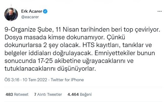 9-Organize Şube, 11 Nisan tarihinden beri top çeviriyor. Dosya masada kimse dokunamıyor. Çünkü dokunurlarsa 2 şey olacak. HTS kayıtları, tanıklar ve belgeler iddiaları doğrulayacak. Emniyettekiler bunun sonucunda 17-25 akibetine uğrayacaklarını ve tutuklanacaklarını düşünüyorlar.