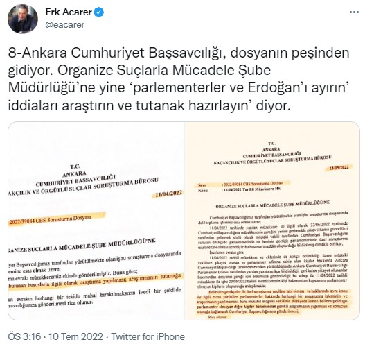 8-Ankara Cumhuriyet Başsavcılığı, dosyanın peşinden gidiyor. Organize Suçlarla Mücadele Şube Müdürlüğü’ne yine ‘parlementerler ve Erdoğan’ı ayırın’ iddiaları araştırın ve tutanak hazırlayın’ diyor.