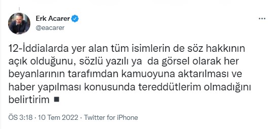 12-İddialarda yer alan tüm isimlerin de söz hakkının açık olduğunu, sözlü yazılı ya da görsel olarak her beyanlarının tarafımdan kamuoyuna aktarılması ve haber yapılması konusunda tereddütlerim olmadığını belirtirim▪️