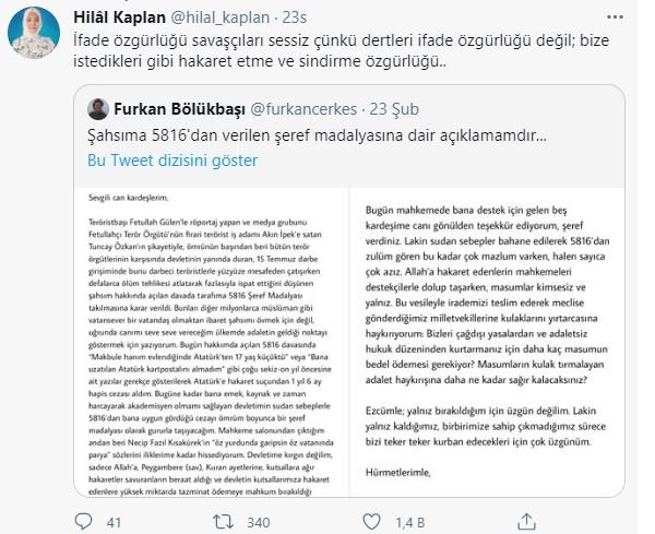 Marmara Üniversitesi ‘Araştırma Görevlisi’ Furkan Bölükbaşı'nın paylaşımını alıntılayan Hilal Kaplan, "İfade özgürlüğü savaşçıları sessiz çünkü dertleri ifade özgürlüğü değil; bize istedikleri gibi hakaret etme ve sindirme özgürlüğü.." ifadelerini kullandı.