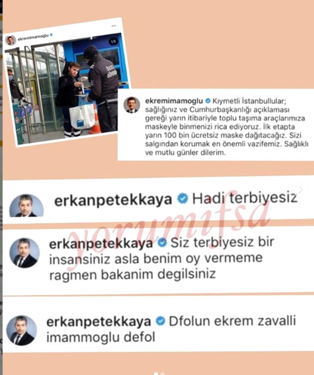 İBB Başkanı İmamoğlu, Instagram hesabından toplu taşıma araçlarına maskeyle binilmesi gerektiğini hatırlatan bir paylaşım yaptı. Ünlü oyuncu Erkan Petekkaya'nın paylaşımın altına yaptığı yorum ise olay oldu. Petekkaya, İmamoğlu için "Terbiyesiz, zavallı, defol" gibi ifadeler kullandı.