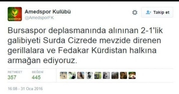 30 Mart 2014 Yerel Seçimleri sonrası Diyarbakır Büyükşehir Belediye Başkanı olan Gülten Kışanak’ın o zamanki adı “Belediye Diski Spor” olan futbol takımının ismini Amedspor olarak değiştirmesiyle "proje" olarak anılan kulüp, 2016’da Ankaragücü maçında yaşanan olayları ırkçılıkla bağdaştırmaya çalışıyor.