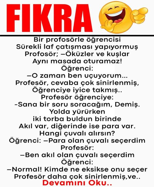 Notumu Yazmayı Unutmuşsunuz ? Üniversite yemekhanesine giren bir öğrenci tüm yerler dolu olduğundan gidip üniversite profesörünün oturduğu masaya oturmuş. Profesör kaşlarını çatarak: –Öküzler ve kuşlar aynı masada oturamaz! Öğrenci: –O zaman ben uçuyorum…