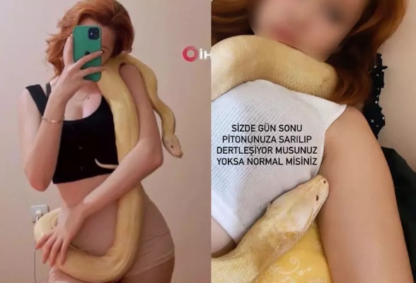 Yavruyken beslemeye başladığı albino pitona sarılmış halde videolar da paylaşan A.Y.'nin, görüntülerden birinde 'Siz de gün sonu pitonunuza sarılıp dertleşiyor musunuz? Yoksa normal misiniz?' yazdığı görüldü.