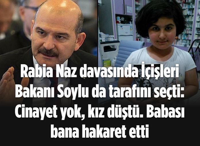 Rabia Naz Vatan'ın şüpheli ölümüne ilişkin konuşan Soylu, konuyu başından beridir yakından takip ettiğini söyleyerek, "Olay bana İstanbul'daki bir arkadaşımdan geldi. Mesaj attı, 'Bu olayda başka bir şey konuşuluyor' diye. Ben de 'Böyle bir şey söz konusu değil' dedim. Rabia Naz'ın babasını çağırdım, konuştum. Müfettişi gönderdim. Teftiş heyeti oluşturdum.