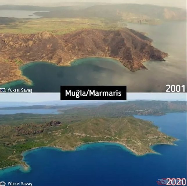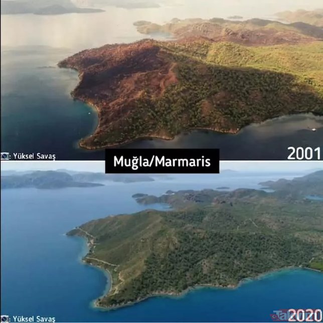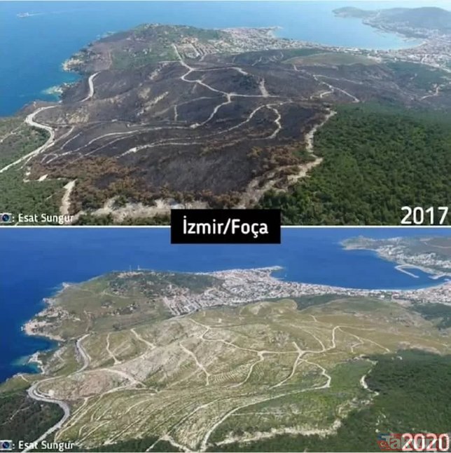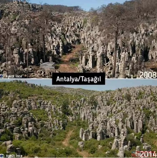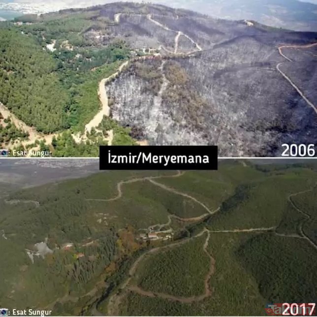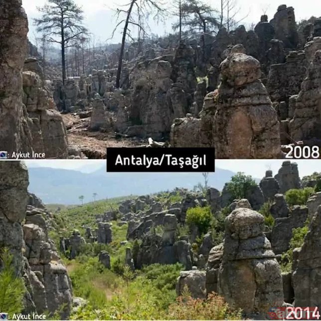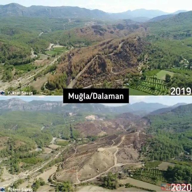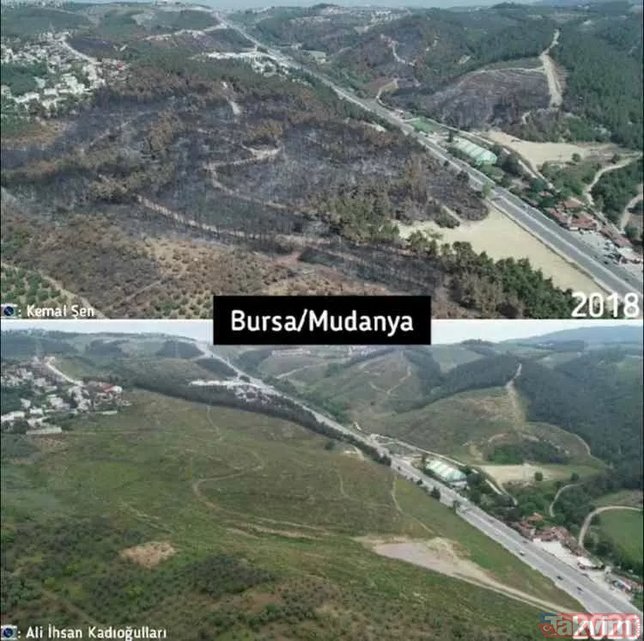 Türkiye'de çıkan orman yangınları üzerine bazı sosyal medya hesaplarında algı çalışmaları başladı. Yangınların rant dolayısıyla çıktığını iddia eden ve hiçbir dayanakları olmayan iddialara en güzel cevap Orman Genel Müdürlüğü'nden geldi. İşte karşılaştırmalı fotoğraflarla yangın öncesi ve sonrası orman fotoğrafları...