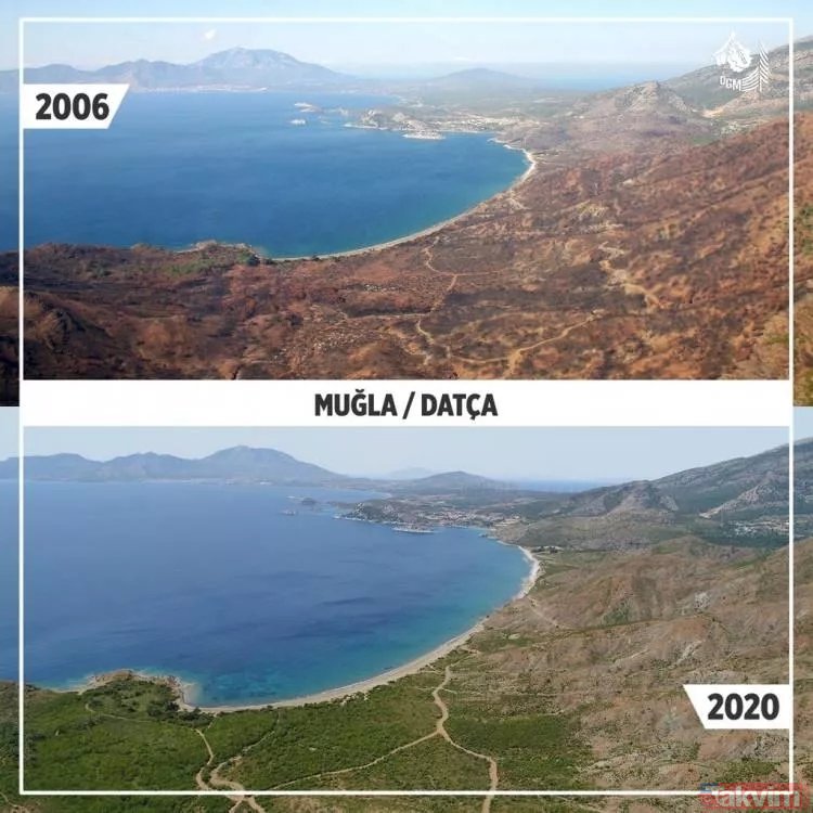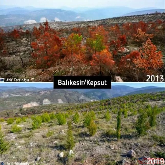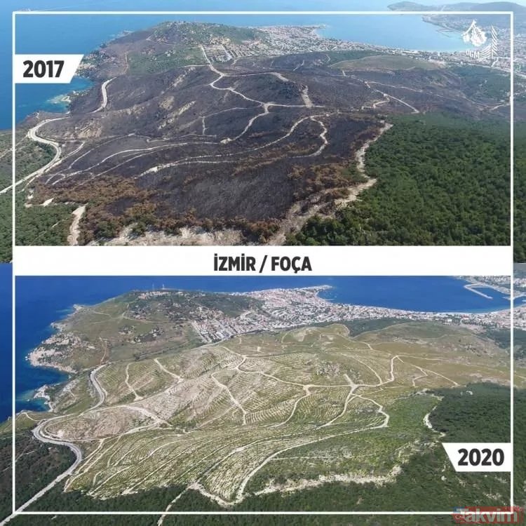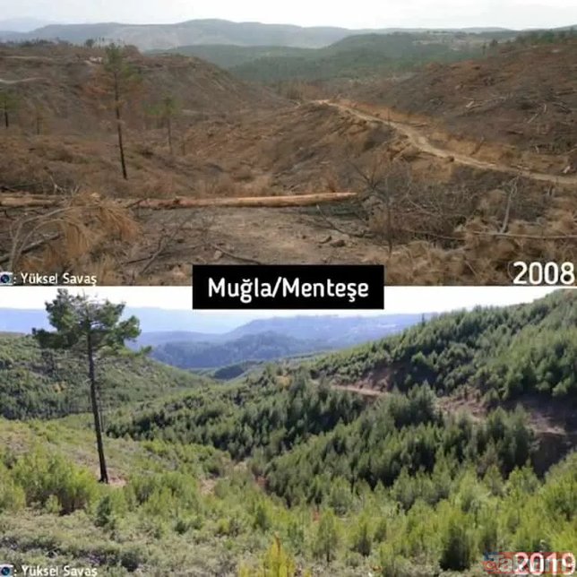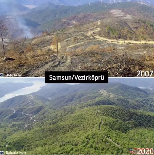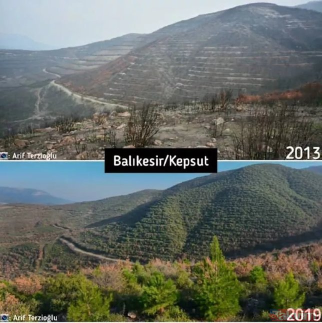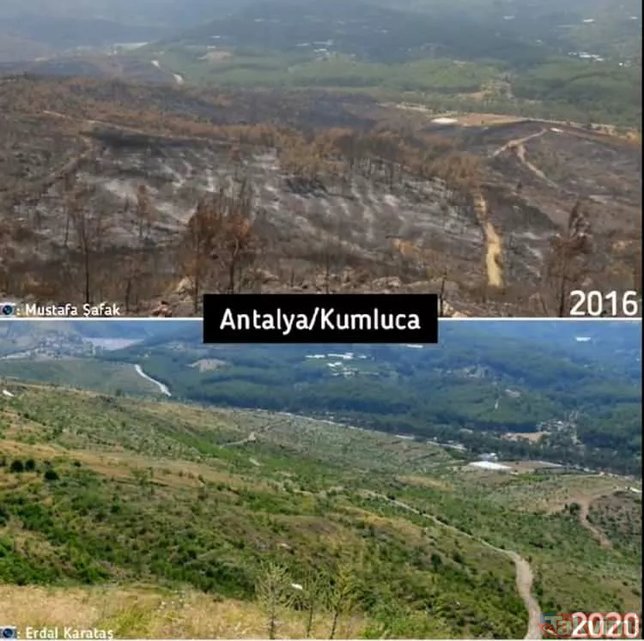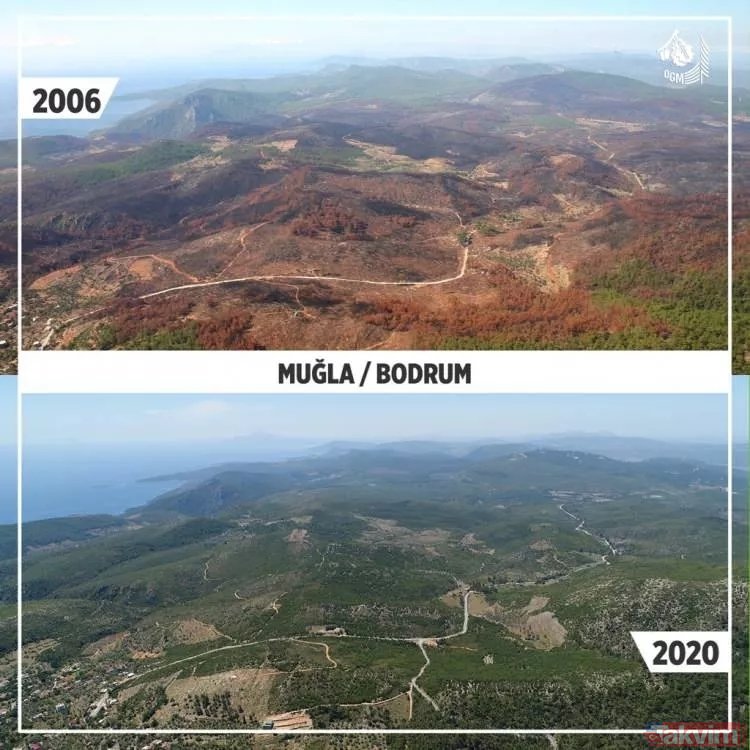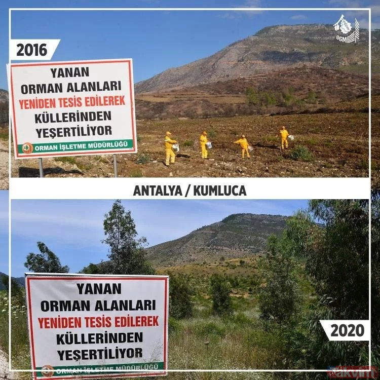Orman Genel Müdürlüğü geçmişten günümüze yangın çıkan ormanlarda yapılan yeşillendirme çalışmalarını paylaştı ve ekledi: "Yanan ormanların Anayasa'nın 169. Maddesi ile korunduğunu biliyor muydunuz? Dilerseniz, yapılan ağaçlandırma çalışmalarını, yangın sahalarına giderek yerinde görebilirsiniz."