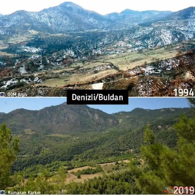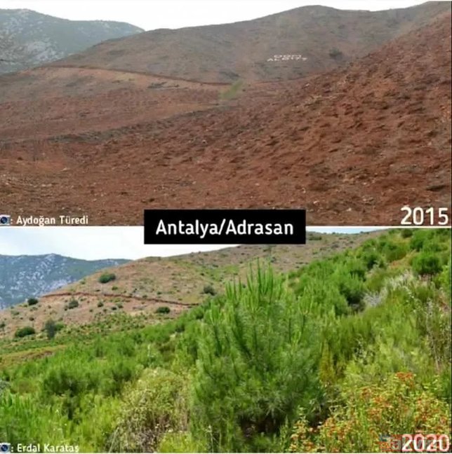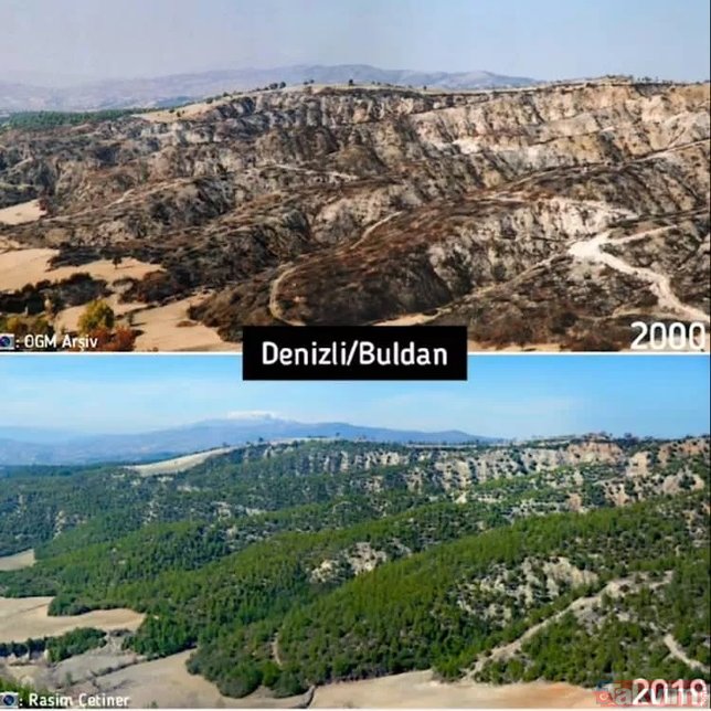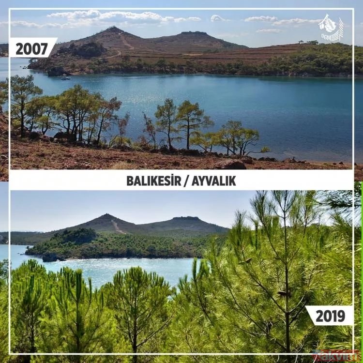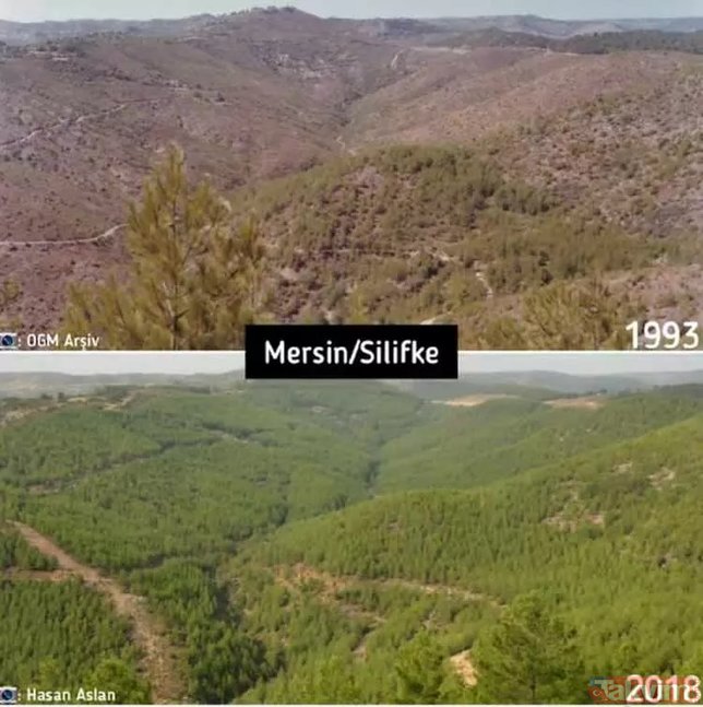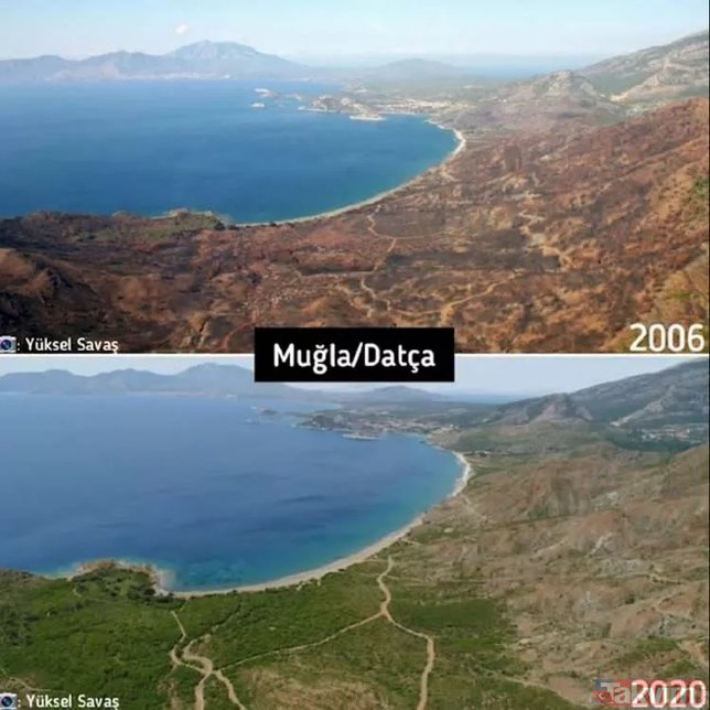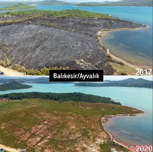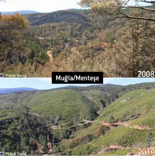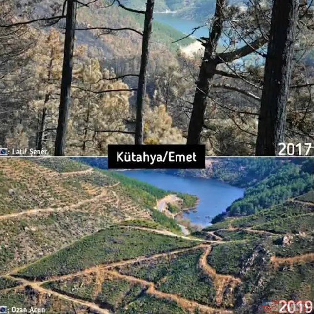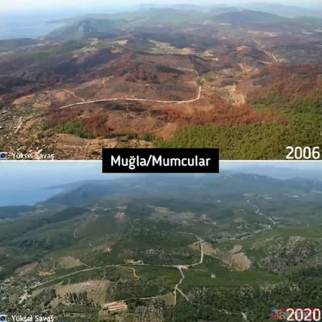 Orman Genel Müdürlüğü geçmişten günümüze yangın çıkan ormanlarda yapılan yeşillendirme çalışmalarını paylaştı ve ekledi: "Yanan ormanların Anayasa'nın 169. Maddesi ile korunduğunu biliyor muydunuz? Dilerseniz, yapılan ağaçlandırma çalışmalarını, yangın sahalarına giderek yerinde görebilirsiniz."
