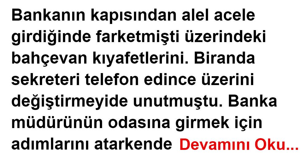 Bankanın kapısından alel acele girdiğinde farketmişti üzerindeki bahçevan kıyafetlerini. Bir anda sekreteri telefon edince üzerini değiştirmeyide unutmuştu. Banka müdürünün odasına girmek için adımlarını atarkende kendi kendinede gülüyordu.