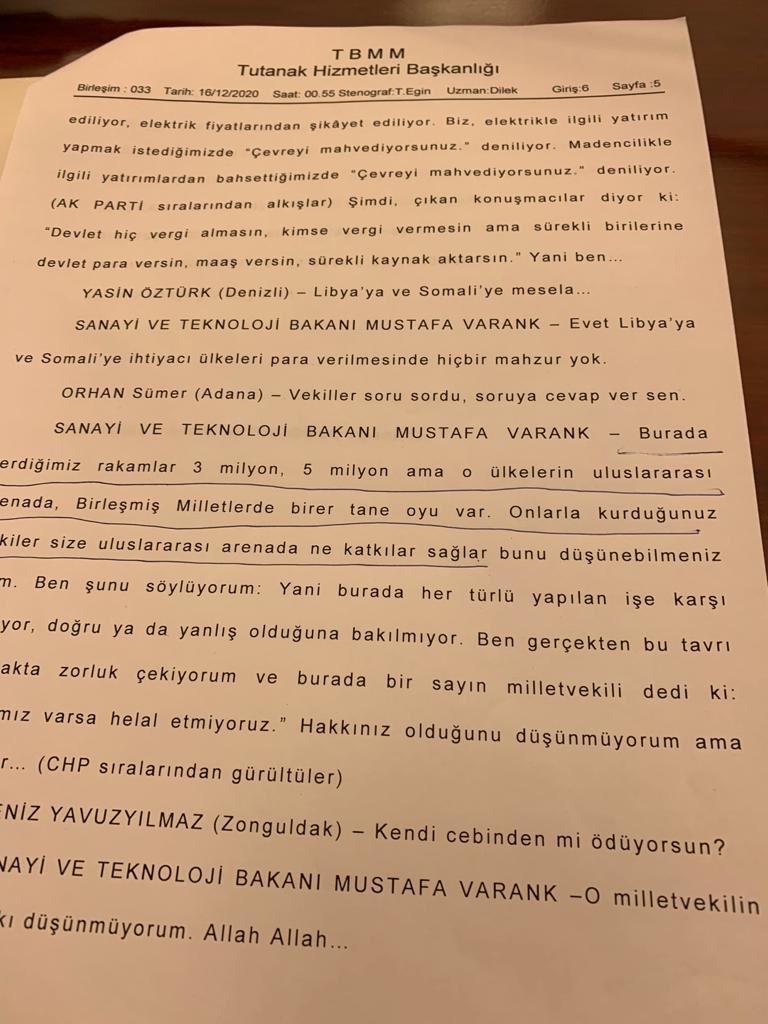 CHP Artvin Milletvekili Uğur Bayraktar, "Dün gece Sanayi ve Teknoloji Bakanı Varank’ın tutanaklardaki diğer ülkelere “3 milyon, 5 milyon verip” oy aldıklarına ilişkin skandal sözleri... Yorumsuz!"diyerek söz konusu konuşmanın tutanağını sosyal medya hesabından paylaştı.