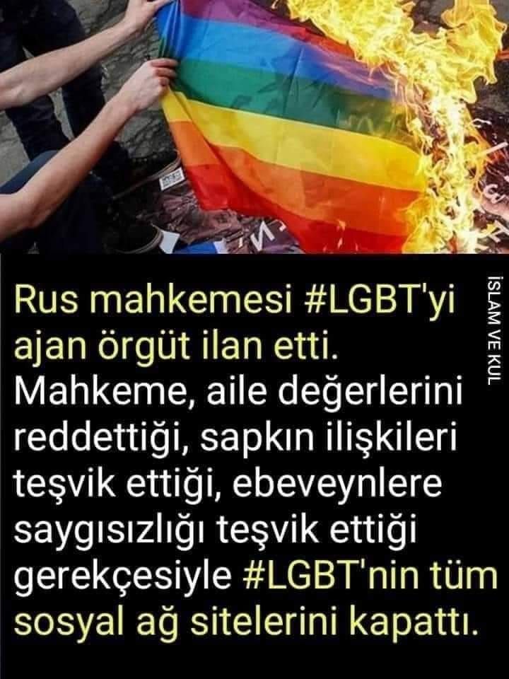 Türkiye'de her türden dernekleşme ve faaliyet yürütme izni verilen LGBT'nin Rusya'da (mahkeme kararıyla) aile değerlerini reddettiği, sapkın ilişkileri teşvik ettiği gerekçesiyle tüm sosyal ağ siteleri kapatıldı.