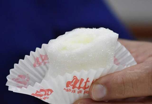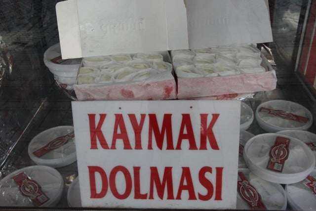 “Kaymak dolmasını sadece soğuk havalarda, 4-5 ay yapıyoruz. Yazın havaların sıcak olmasından dolayı kaymak çabuk eriyor, bu da ürünün çabuk bozulmasına neden oluyor. Bu ürünü üç dört gün içerisinde tüketmek gerekir. Müşterilerimiz kış aylarında sipariş verip bizden kaymak dolması yapmamızı talep ediyor. Kaymak dolması ilk yapıldığı gün tüketilmez çünkü dışının şekeri ilk çıktığı gün sert olur. İçindeki manda kaymağı bir gün süreyle dışındaki şekeri yumuşatır. Yenme kıvamı bir gün sonradır. Dışındaki şeker de kaymağı gibi yumuşak bir kıvam alır.”
