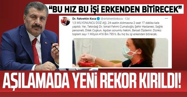 "Bu hız bu işi erken bitirecek" diyen Bakan Koca, 1.5 milyonuncu doz aşının Tekirdağ Dr. İsmail Fehmi Cumalıoğlu Şehir Hastanesi'nde uygulandığı duyurdu.