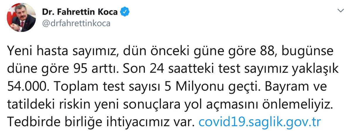 Sağlık Bakanı Fahrettin Koca, Türkiye’nin günlük corona virüsü tablosunu paylaştı. Verilere göre 53 bin 842 testin daha yapılmasıyla toplam test sayısı 5 milyon 27 bin 308’e ulaştı.