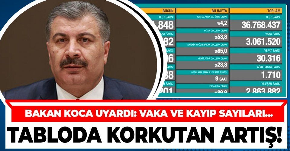 Türkiye Günlük Koronavirüs Tablosu, "covid19.saglik.gov.tr" adresinden paylaşıldı. Buna göre, son 24 saatte 211 bin 848 Kovid19 testi yapıldı, 26 bin 182 kişinin Kovid19 testi pozitif çıktı, 138 kişi yaşamını yitirdi, hasta sayısı 1006 oldu. Son 24 saatte 19 bin 201 kişinin Kovid19 tedavisi ya da karantinasının sona ermesiyle iyileşen sayısı 2 milyon 863 bin 882'ye yükseldi.