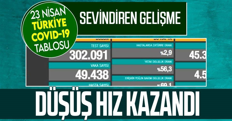 Sağlık Bakanlığı 23 Nisan 2021 koronavirüs vaka ve vefat sayılarını içeren Kovid19 tablosunu paylaştı. Tabloya göre, son 24 saatte yapılan 302 bin 91 testte 49 bin 438 vaka, 3 bin 89 hasta tespit edildi. Virüs nedeniyle 343 kişi hayatını kaybederken, 60 bin 176 kişinin de tedavisi ve karantinası sona erdi. İYİLEŞEN SAYISI 4 MİLYONA YAKLAŞTI 22 NİSAN KORONAVİRÜS TABLOSU 21 NİSAN KORONAVİRÜS TABLOSU
