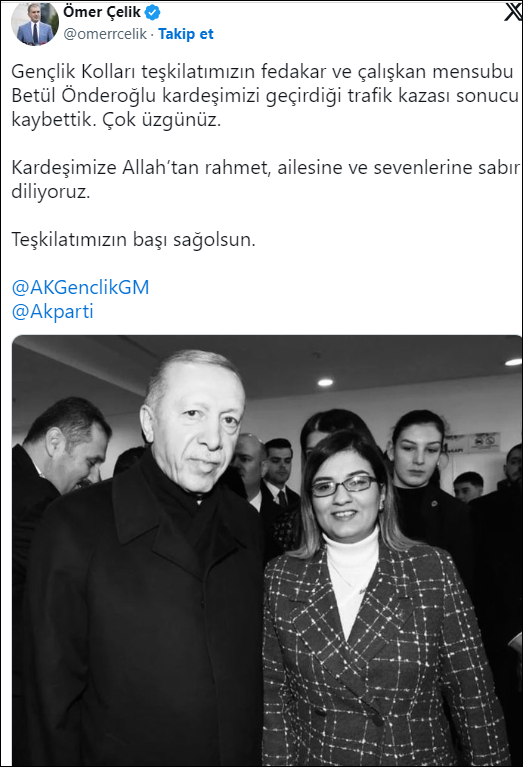Çelik, sosyal medya hesabından yaptığı paylaşımda, "Gençlik Kolları teşkilatımızın fedakar ve çalışkan mensubu Betül Önderoğlu kardeşimizi geçirdiği trafik kazası sonucu kaybettik. Çok üzgünüz. Kardeşimize Allah'tan rahmet, ailesine ve sevenlerine sabır diliyoruz. Teşkilatımızın başı sağ olsun." ifadelerini kullandı.