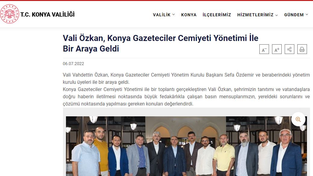 Konya Valiliğin resmi internet sitesinde de yer alan haberde Konya Valisi Vahdettin Özkan’ın Konya Meram Millet Bahçesi’nde bulunan bir balık restoranında cemiyet üyeleriyle bir araya geldiği bir haber yer aldı.